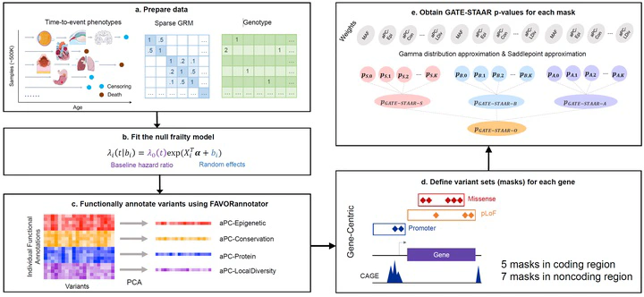 Rare variants (RV) identified through whole genome sequencing hold great promise for elucidating the genetic basis of disease onset, but existing methods for RV association testing are not well suited for time-to-event phenotypes. Here, we develop GATE-STAAR, a scalable and accurate framework integrating frailty modeling with functional annotations. We propose a rare-variant saddlepoint approximation to handle heavy censoring. Through comprehensive simulations and large-scale analysis of approximately 400 K UK Biobank participants, with replication in approximately 230 K All of Us participants, GATE-STAAR uncovers biologically meaningful RV associations while ensuring rigorous control of type I error. This framework is powerful to dissect the genetic architecture of disease onset and progression and advance precision medicine.
