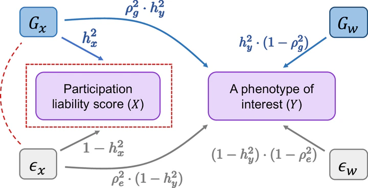 It is increasingly recognized that participation bias can pose problems for genetic studies. Recently, to overcome the challenge that genetic information of nonparticipants is unavailable, it is shown that by comparing the IBD (identity by descent) shared and not-shared segments between participating relative pairs, one can estimate the genetic component underlying participation. That, however, does not directly address how to adjust estimates of heritability and genetic correlation for phenotypes correlated with participation. Here, we demonstrate a way to do so by adopting a statistical framework that separates the genetic and nongenetic correlations between participation and these phenotypes. Crucially, our method avoids making the assumption that the effect of the genetic component underlying participation is manifested entirely through these other phenotypes. Applying the method to 12 UK Biobank phenotypes, we found eight that have significant genetic correlations with participation, including body mass index, educational attainment, and smoking status. For most of these phenotypes, without adjustments, estimates of heritability and the absolute value of genetic correlation would have underestimation biases.